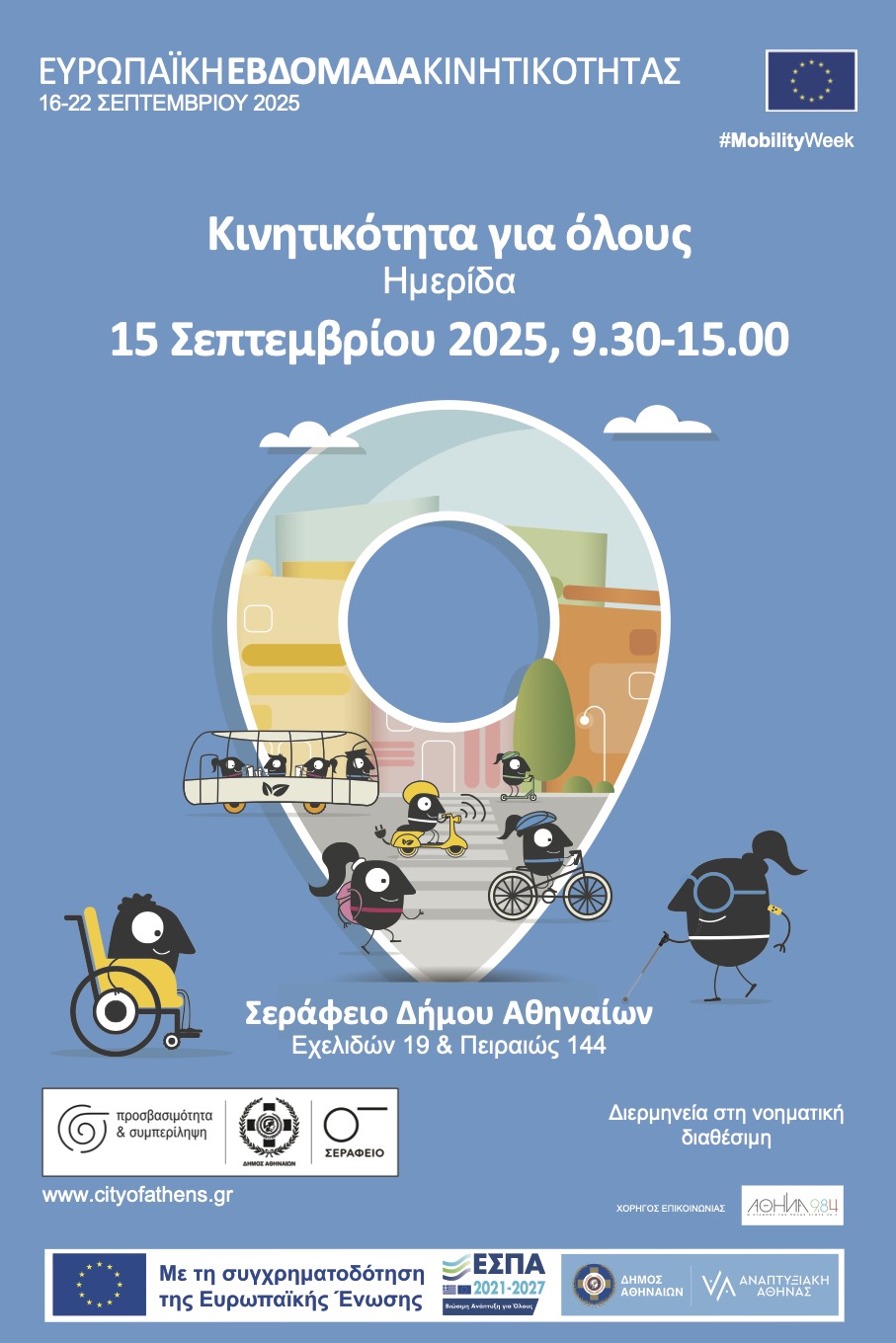 Ημερίδα με θέμα «Κινητικότητα για Όλους» – 15/9/25, Σεράφειο Δήμου Αθηναίων, 9:30–15:00: Παρουσίαση δράσεων και προγραμμάτων για τη βελτίωση της κινητικότητας στην Αθήνα και συζήτηση για προοπτικές, προκλήσεις και προβλήματα. Συμμετέχουν ο ΟΑΣΑ, η ΣΤΑΣΥ και φορείς που δραστηριοποιούνται στα πεδία της αναπηρίας και της κινητικότητας. Την ημερίδα συντονίζουν οι Ντάμες Σπαθί: Ελευθερία Κουμάντου και Ελεωνόρα Ορφανίδου, ενώ θα υπάρχει διερμηνεία στην Ελληνική Νοηματική Γλώσσα.