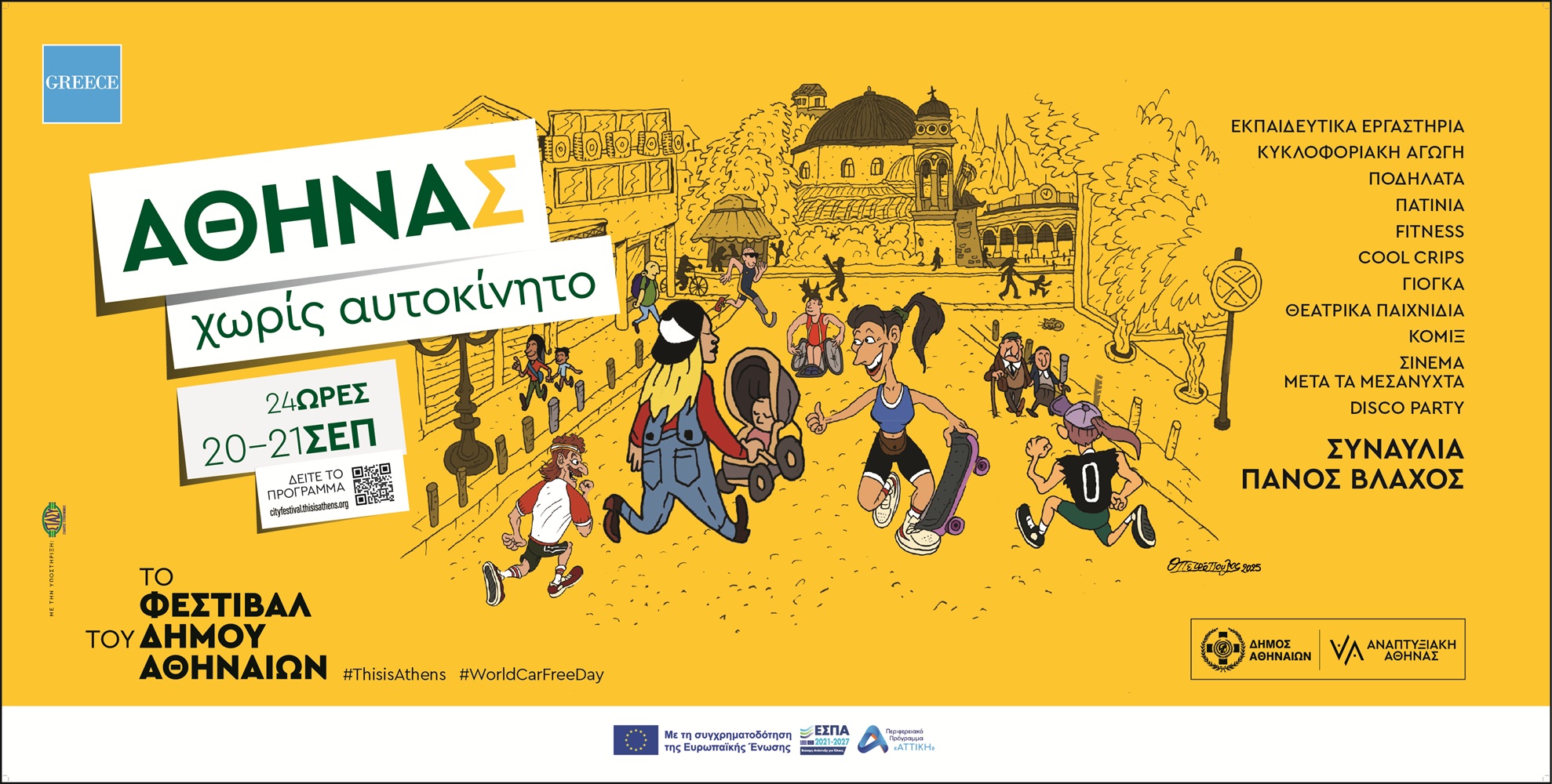 Η πρωτοβουλία «Αθηνάς Χωρίς Αυτοκίνητο» που διοργανώνεται για 2η χρονιά φέτος από το Φεστιβάλ του Δήμου Αθηναίων μέσω της Αναπτυξιακής Αθήνας, δίνει την ευκαιρία σε κατοίκους και επισκέπτες να δουν το κέντρο της πρωτεύουσας με άλλη ματιά: ως έναν χώρο συνάντησης, παιχνιδιού, μουσικής και ελεύθερης μετακίνησης, έναν χώρο που αναπνέει διαφορετικά και δείχνει τον δρόμο για μια πόλη πιο ανθρώπινη και βιώσιμη, αλλά και ως έναν προορισμό για τους επισκέπτες μέσω της ανάδειξης καινοτόμων εμπειριών και της αξιοποίησης του πολιτιστικού αποθέματος της Αθήνας.