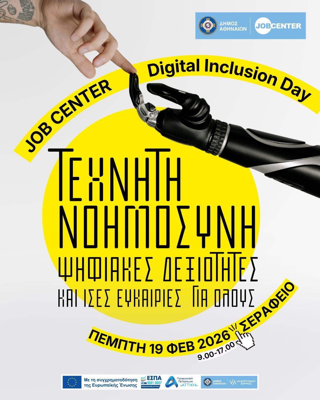 Μια ημερίδα αφιερωμένη στην ψηφιακή συμπερίληψη, την υπεύθυνη αξιοποίηση της Τεχνητής Νοημοσύνης (AI) και τη στήριξη της ισότιμης πρόσβασης στην αγορά εργασίας, διοργανώνει την Πέμπτη 19 Φεβρουαρίου 2026, το Job Center του Δήμου Αθηναίων, στο Σεράφειο Κέντρο Αθλητισμού, Πολιτισμού και Καινοτομίας.