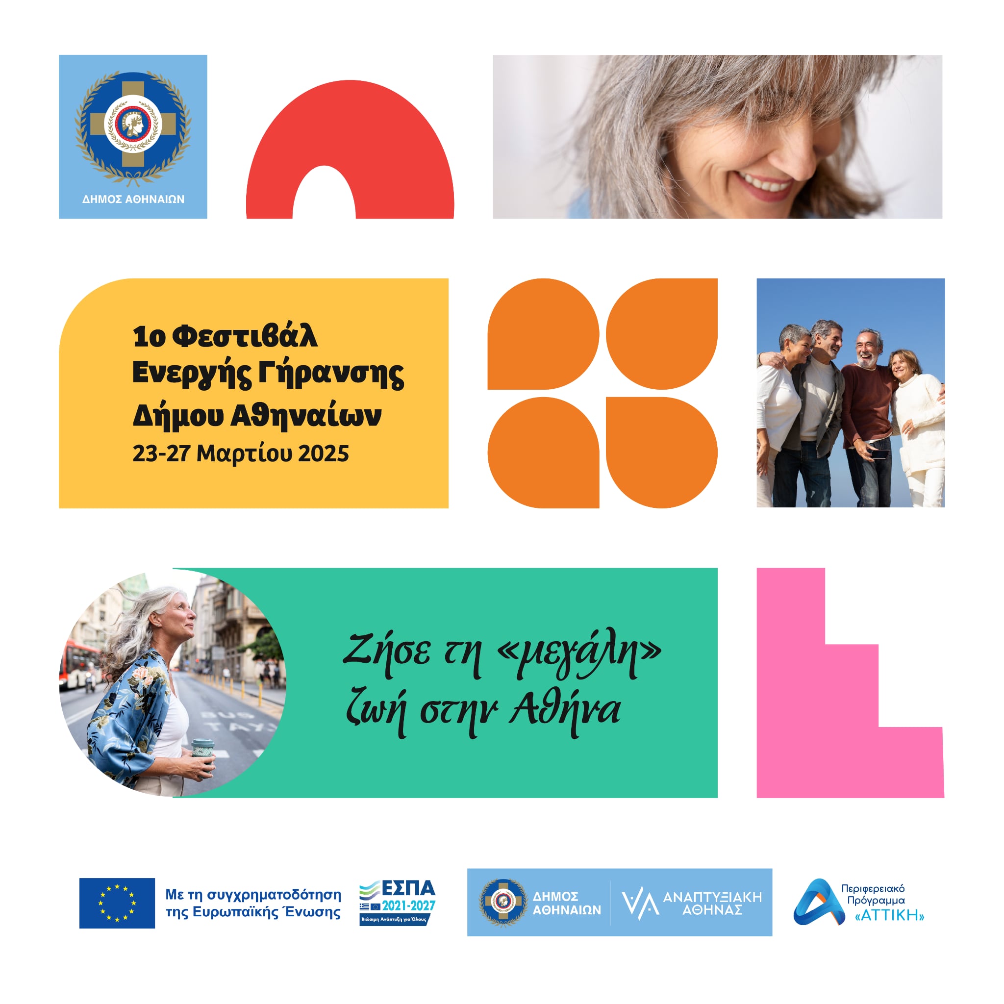 Ο Δήμος Αθηναίων διοργανώνει για πρώτη φορά Φεστιβάλ Ενεργής Γήρανσης, μια ιδιαίτερη γιορτή με σύνθημα «Ζήσε τη ‘’μεγάλη’’ ζωή στην Αθήνα». Από τις 23 έως τις 27 Μαρτίου 2025, οι επισκέπτες θα έχουν την ευκαιρία να συμμετάσχουν σε μια σειρά από πολιτιστικές και κοινωνικές δράσεις που προάγουν τη συμμετοχή και την ενεργό ζωή για τα άτομα μεγαλύτερης ηλικίας στην πόλη. Η Συμπερίληψη, η Ζωή, η Ενέργεια, η Ομάδα, η Υποστήριξη και το Αστικό Περιβάλλον ξεδιπλώνονται σε εμβληματικούς χώρους της Αθήνας, όπως το Πολιτιστικό Κέντρο «Μελίνα», ο Εθνικός Κήπος και το Ίδρυμα Βασίλη & Ελίζας Γουλανδρή.