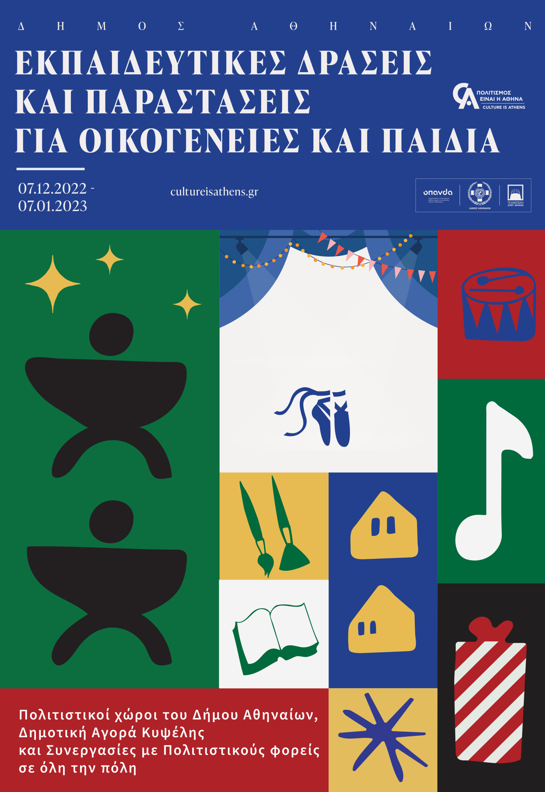 Θέατρο, Μουσική, Παραμύθια, Κάλαντα, Εκπαιδευτικά προγράμματα, Εικαστικά εργαστήρια, Αφηγήσεις, Καραγκιόζης, Χοροθέατρο και πολλά άλλα με ελεύθερη συμμετοχή
