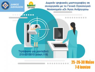 Η Διεύθυνση Δημοτικών Ιατρείων & Δημόσιας Υγείας του Δήμου Αθηναίων υπό την εποπτεία του αρμόδιου Αντιδημάρχου Μανόλη Καλαμπόκα σε συνεργασία με το Σύλλογο Φίλων του Γενικού Ογκολογικού Νοσοκομείου “Οι Άγιοι Ανάργυροι” και το ΕΔΔΥΠΠΥ συνδιοργανώνουν πρόγραμμα Δωρεάν Μαστογραφικού Ελέγχου για γυναίκες ηλικίας μεταξύ 40 – 69 ετών.