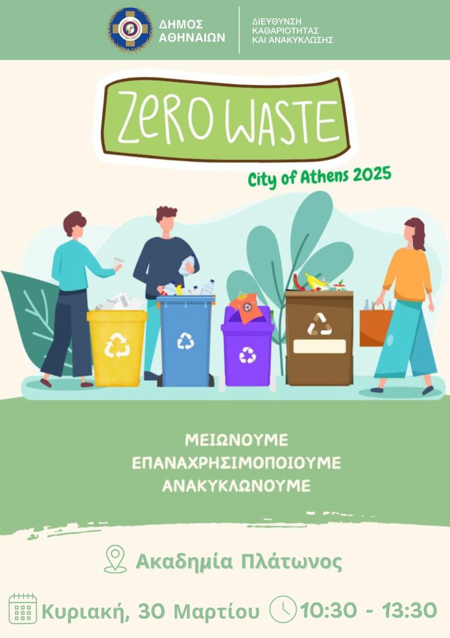 H Διεύθυνση Καθαριότητας & Ανακύκλωσης του Δήμου Αθηναίων, στο πλαίσιο της Παγκόσμιας Ημέρας Μηδενικών Αποβλήτων (International Day of Zero Waste), προσκαλεί μικρούς και μεγάλους σε μία υπαίθρια, ανοιχτή δράση που θα πραγματοποιηθεί την Κυριακή 30 Μαρτίου 2025, στην Ακαδημία Πλάτωνος, από τις 10:30 έως τις 13:30.