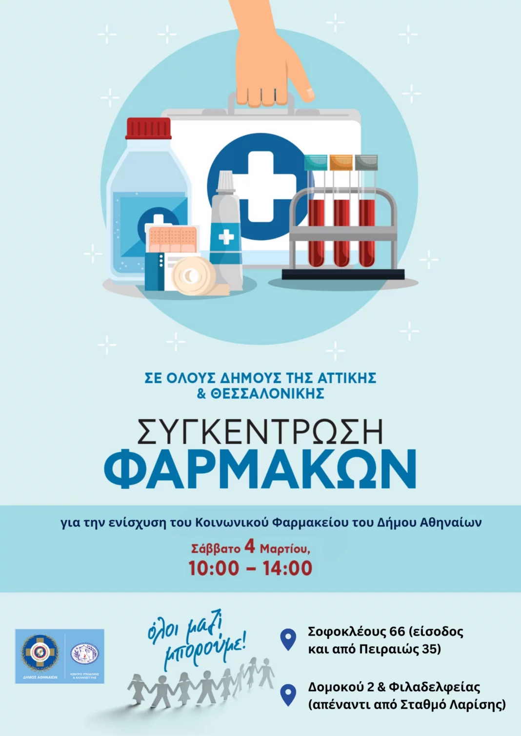 Από τις 10:00 έως τις 14:00 τα μέλη του Κοινωνικού Φαρμακείου θα υποδέχονται δωρεές φαρμάκων, τα οποία θα διατεθούν στους άπορους και ανασφάλιστους πολίτες που στηρίζει αδιάλειπτα η συγκεκριμένη δομή, στα εξής σημεία: