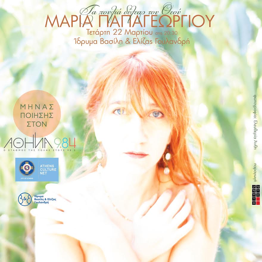 O Αθήνα 9.84 και το Athens Culture Net του Δήμου Αθηναίων παρουσιάζουν σήμερα Τετάρτη 22 Μαρτίου στις 20:30, στο Αμφιθέατρο του Ιδρύματος Βασίλη και Ελίζας Γουλανδρή μια συναυλία με την Μαρία Παπαγεωργίου, μια συναυλία βασισμένη στο λόγο των ποιητών!