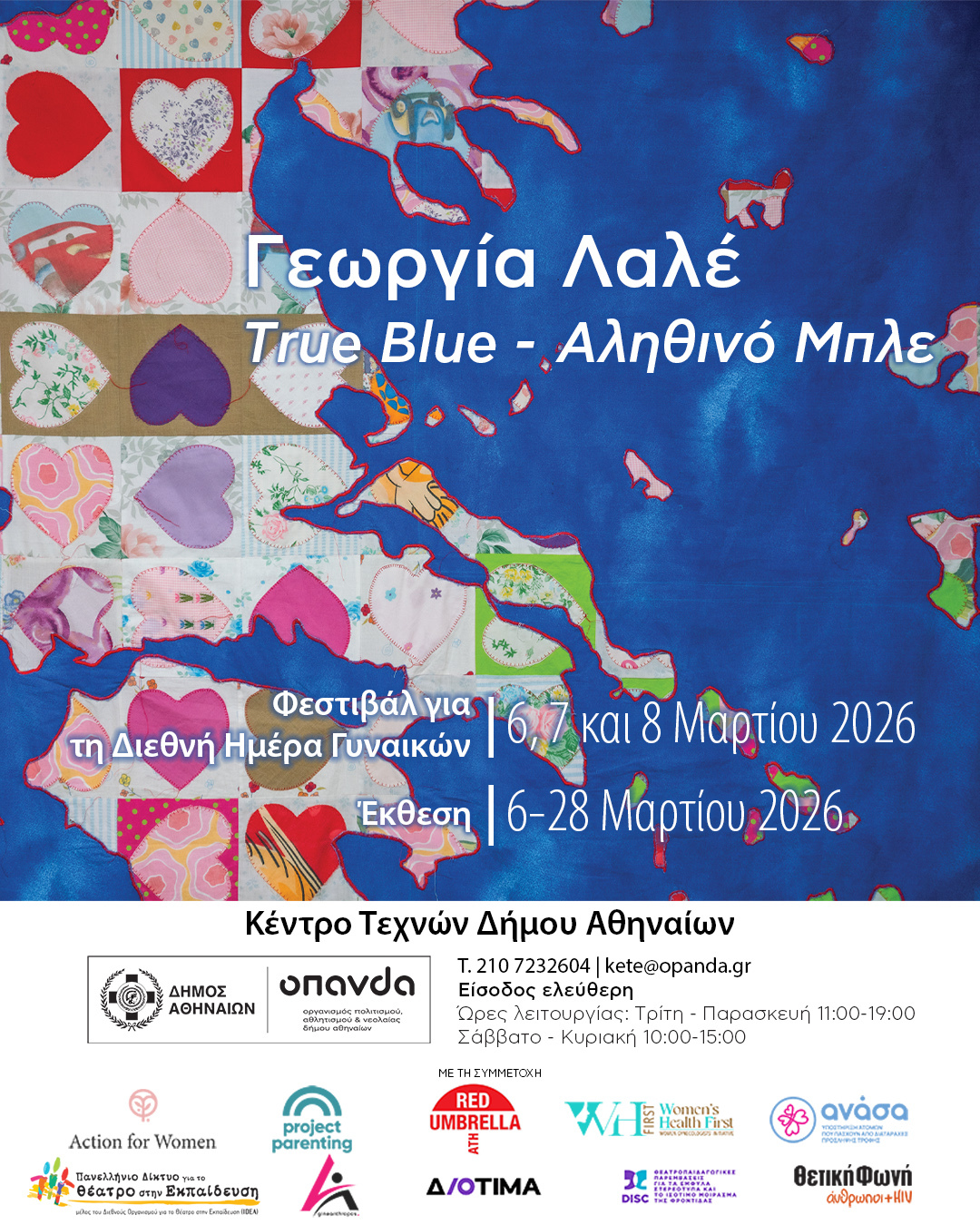 Με αφορμή τη Διεθνή Ημέρα των Γυναικών που τιμάται κάθε χρόνο στις 8 Μαρτίου, ο Δήμος Αθηναίων, μέσω του Οργανισμού Πολιτισμού, Αθλητισμού και Νεολαίας του Δήμου Αθηναίων (ΟΠΑΝΔΑ) και η εικαστικός Γεωργία Λαλέ συνδιοργανώνουν το φεστιβάλ “True Blue – Αληθινό Μπλε” στις 6, 7 και 8 Μαρτίου 2026 στο Κέντρο Τεχνών Δήμου Αθηναίων. Στο πλαίσιο του φεστιβάλ θα παρουσιαστεί ομώνυμη έκθεση της καλλιτέχνιδας έως τις 29 Μαρτίου 2026.