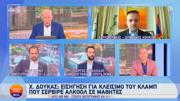 Ο Δήμαρχος Αθηναίων, Χάρης Δούκας, μίλησε την Τετάρτη 30 Οκτωβρίου στην εκπομπή Καλημέρα Ελλάδα στον Ant1 και τον Γιώργο Παπαδάκη, αναφορικά με την υπόθεση του νυχτερινού κλαμπ στη Λεωφόρο Βουλιαγμένης όπου παρατηρήθηκαν περιστατικά βαριάς μέθης σε ανήλικους. Ακολουθούν τα βασικά σημεία της τοποθέτησής του.